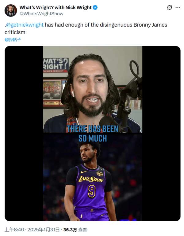 Vào ngày 9 tháng 11, mùa giải NBA mới tiếp tục diễn ra. Phong độ của Bronny rất nổi bật trong thời gian gần đây, điều này khiến anh nhận được rất nhiều lời khen ngợi. Người phát ngôn nổi tiếng Nick Wright thẳng thắn cho rằng Bronny đã ở trên mức trung bình khi kết thúc hiệp hai. Bất cứ ai dùng anh ta làm súng để tống tiền James đều phải xấu hổ!